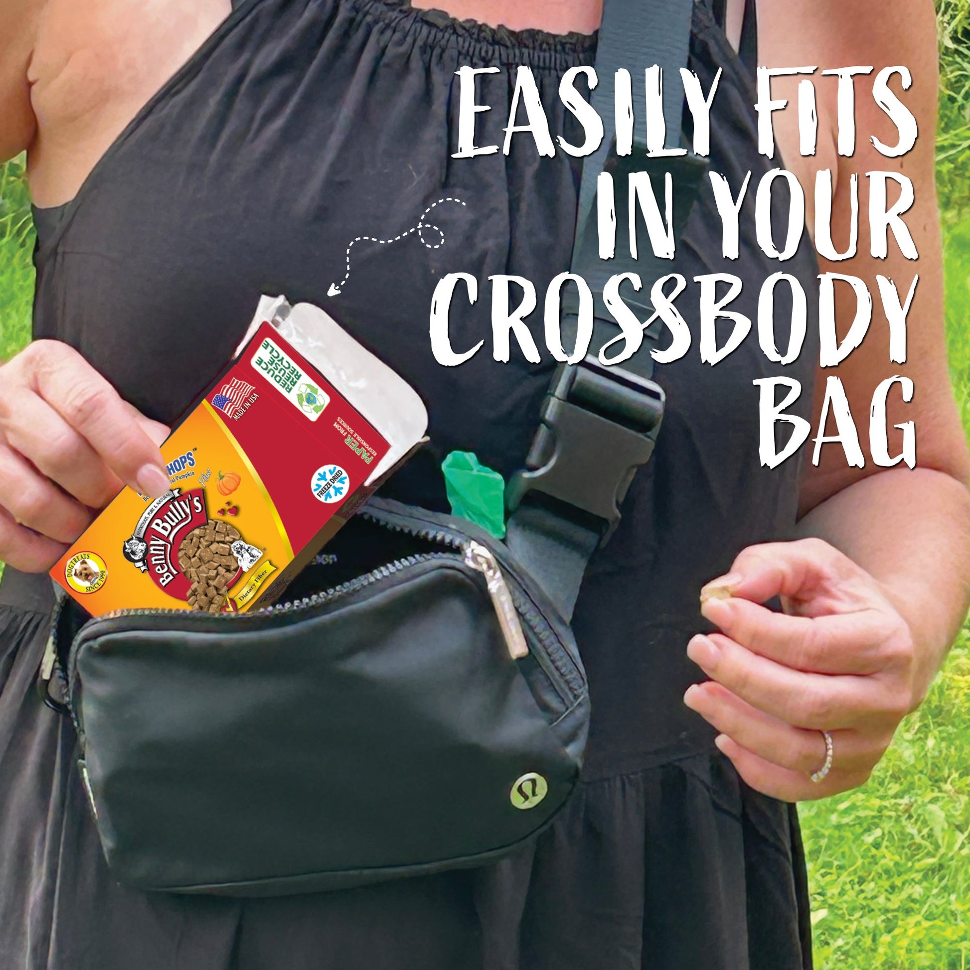 Our yummy mini chops fit easily into a crossbody bag as well as your pocket and are great for training your pet. Made with human grade ingredients, our treats are nutritious, pure and natural. They are also low in calories and come in 100% recyclable packaging - our way of giving back to the environment.